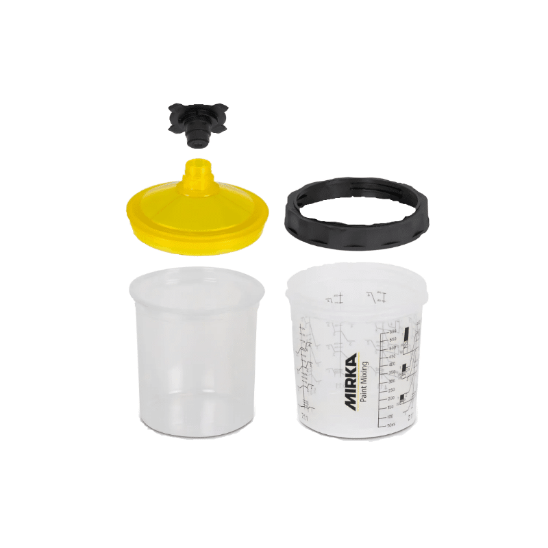 Il sistema di tazze per vernice Mirka è un sistema completo, pronto per essere collegato alla pistola a spruzzo (adattatore per pistola a spruzzo da acquistare separatamente). Il set include 45 contenitori e coperchi con filtro da 125 µm, 20 tappi, una tazza esterna rigida e un collare. Tutti i componenti sono resistenti alla corrosione sia della vernice che del diluente.